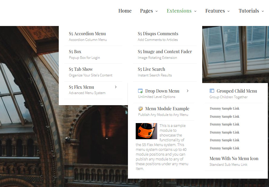 Take your website to the next design level by using the robust and feature rich S5 Flex Menu System. Organize your links with ease and show content in places you never could before!